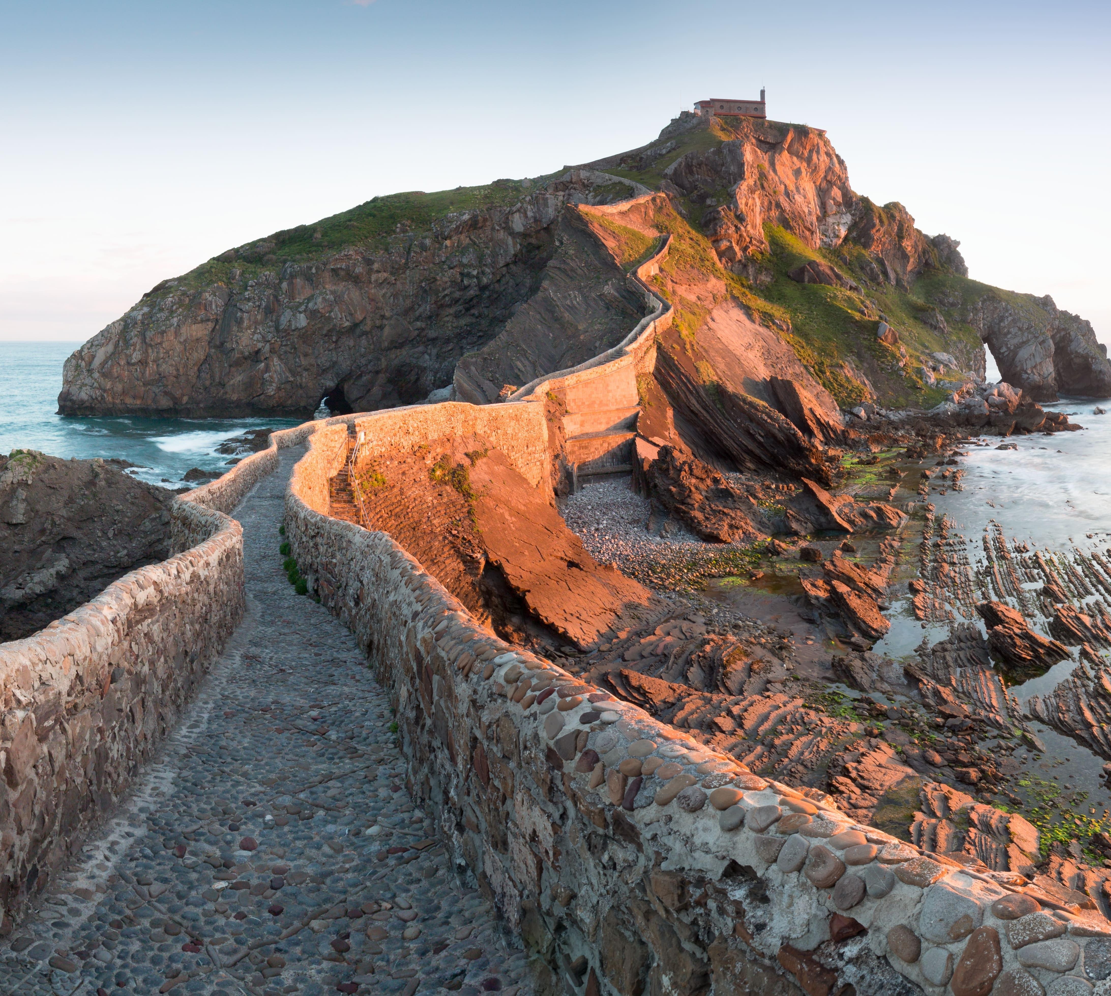 Schwer atmend steigen die meisten Besucher die 231 Steinstufen zur bedeutendsten baskischen Seefahrerkapelle hinauf, wo Ausblicke und Eindrücke überwältigend sind. Die seit dem Mittelalter dokumentierte Kapelle ist zwar meist geschlossen, doch hier ist der Weg das Ziel. Felsnasen ragen rundherum aus dem Atlantik, in der Tiefe des vorgelagerten Massivs rollen die Wellen durch natürliche Bogen. Von den Aussichtsterrassen rund um das kleine Gotteshaus schweift der Blick an den wilden Klippen entlang bis zur Bucht von Bakio und zum leuchtturmbesetzten Kap Matxitxako.