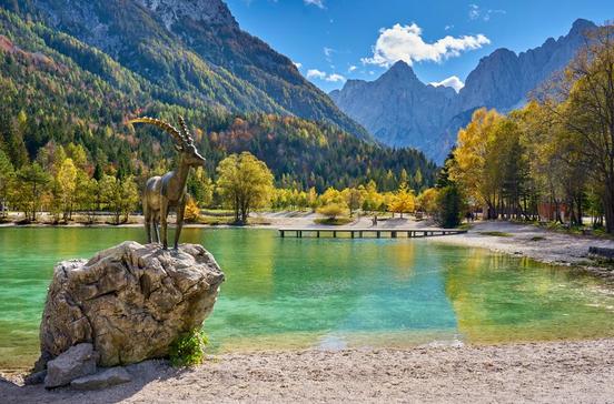 Der Stausee mit dem Denkmal des „Zlatorog”, des Steinbocks mit goldenen Hörnern, friert im Winter zu – dann kannst du auf dem Jasna-See wunderbar Schlittschuh laufen!