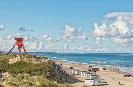 Zu Füßen der prominenten roten Seebake stehen 47 weiße Badehäuschen. Wer keines besitzt – wie die allermeisten –, zieht sich im Auto um, denn hier beginnt der breite Autostrand, der sich nordwärts bis nach Løkken zieht. Es gibt hier so viel Platz, dass sich Sonnenanbeter, Ballspieler, Wind- und Kitesurfer nicht in die Quere kommen.