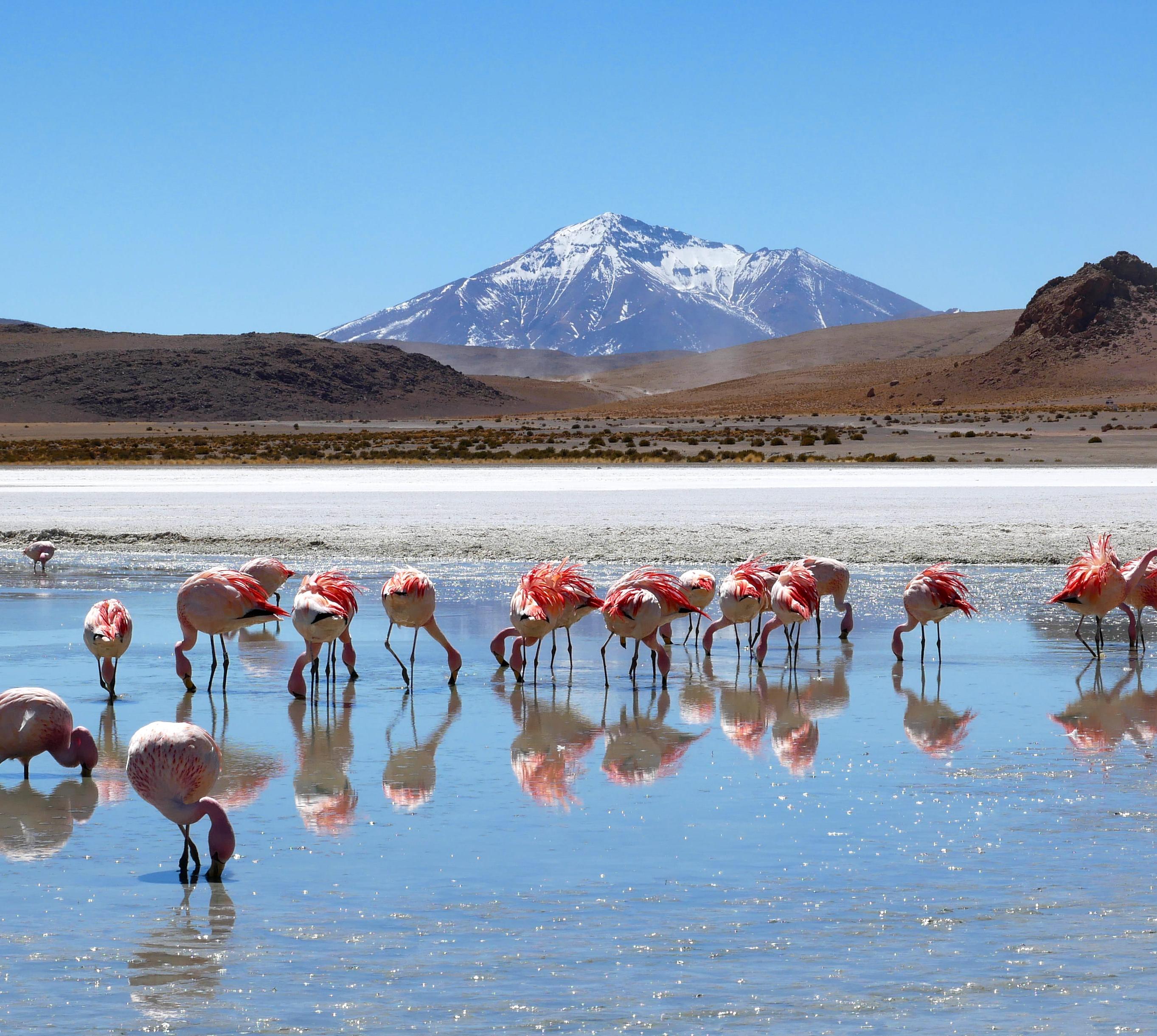 Sonnenbrille und schützende Kleidung braucht, wer sich das „weiße Meer”, die mit 12 000 km² größte Salzfläche der Erde, ansehen will. Der Salar de Uyuni (3660 m hoch), versalzter Rest eines vor Jahrmillionen ausgetrockneten Binnenmeers, liegt 6 Std. mit dem Bus von Potosí entfernt. Mehrtagestouren führen zu weiteren Lagunen und Salzseen, an denen z. T. Flamingos leben. Ein Erlebnis ist die Übernachtung im Hotel de Sal im Norden des Sees; es ist ganz aus Salz erbaut. 3–4-tägige Jeeptouren auf dem Salar und zu den umliegenden Lagunen, Vulkanen und Geysiren.