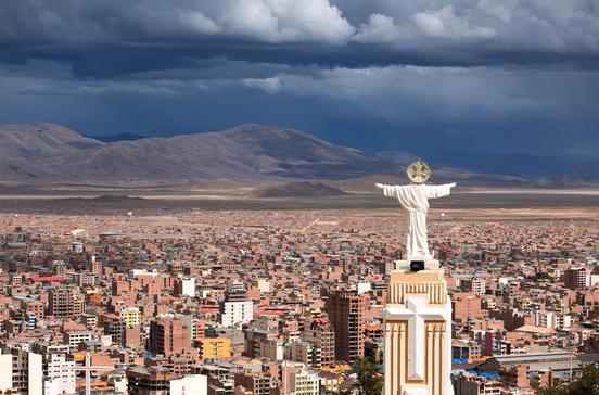 La Paz ist Regierungssitz und die zweitgrößte Stadt des Landes (nach Santa Cruz), nicht aber die Hauptstadt – dieser Titel gebührt Sucre. Gegründet 1548 von dem Spanier Alonso de Mendoza, liegt die heute 1,2 Mio. Einwohner zählende Metropole zum größten Teil geschützt vor den eisigen Hochlandwinden im tiefen Canyon des Río Choqueyapu – den eisbedeckten lllimani (6439 m) immer im Blick. Wobei die bessere Gesellschaft in den tiefer gelegenen Vierteln (barrios) San Miguel, Calacoto oder Zona Sur wohnt. Die Armen müssen mit den kälteren, weil höher gelegenen Stadtteilen vorlieb nehmen, z. B. El Alto (4061 m). Im Zentrum, nahe der Plaza San Francisco, treffen sich die verschiedenen Bevölkerungsgruppen wieder: Rund um die Geschäftshäuser der Weißen und Mestizen wogt ein bunter (Souvenir-) Markt der indígenas. La Paz ist Ausgangspunkt für Touren zum Titicacasee und in die Yungas, die tropischen Täler der Andenostseite, sowie zu den Gipfeln der Königskordillere. Mit dem Bus (2 Std.) erreicht man die südöstlich gelegene Karnevalsstadt Oruro. Vorposten für die Erkundung des Landes Richtung Osten ist das mit dem Flugzeug schnell zu erreichende Cochabamba.