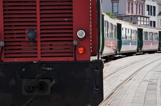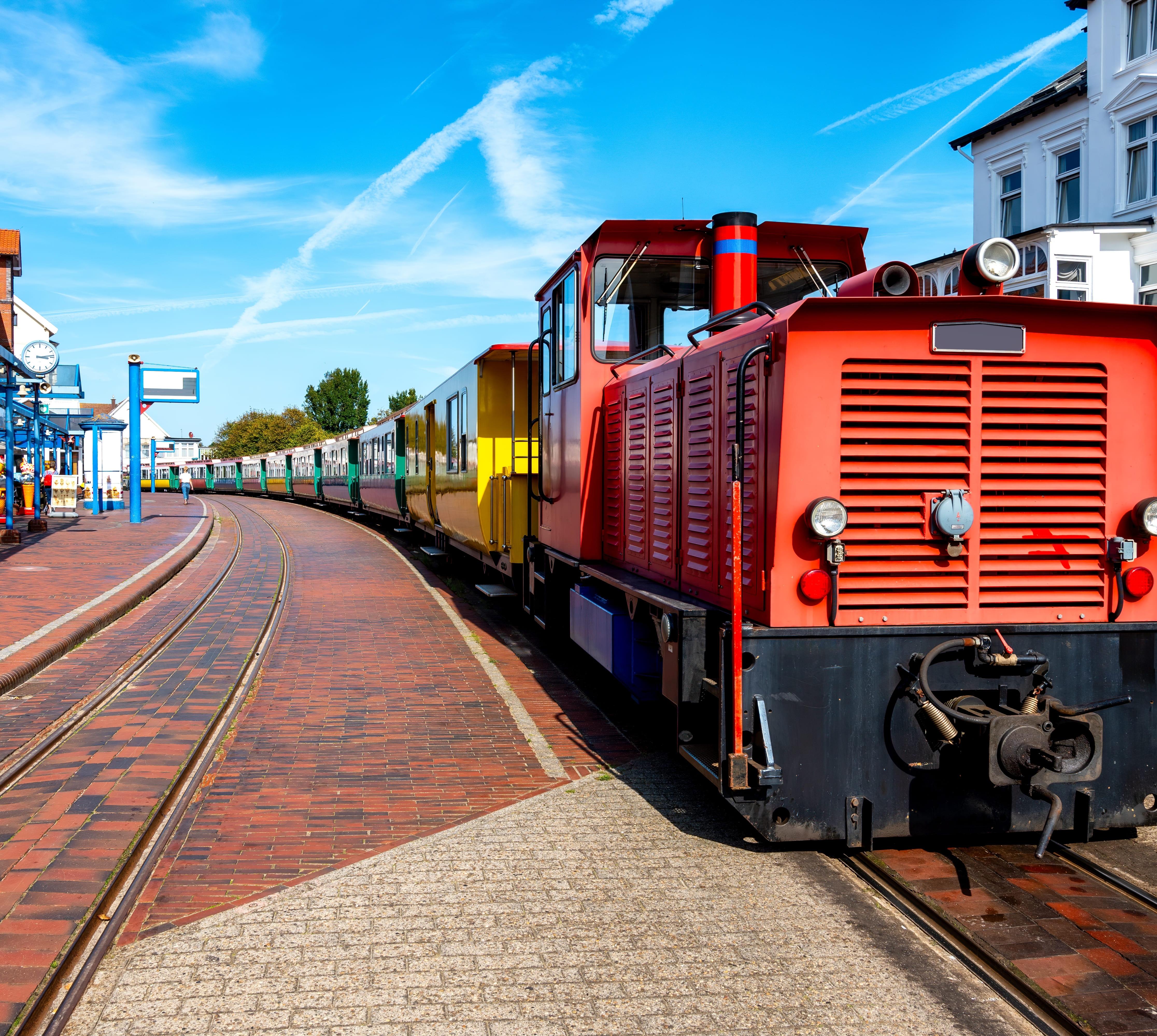 Zwischen Fährhafen und Stadtzentrum verkehrt schon seit 1888 eine Inselbahn, die für die durchgehend zweigleisig ausgebaute Strecke 17 Minuten benötigt. Für militärische Zwecke wurde das Schienennetz ab 1902 ständig erweitert und erreichte im Zweiten Weltkrieg eine Länge von 45 km; nach Kriegsende mussten alle Schienen, außer denen vom Hafen zum Ort Borkum, abgebaut werden. Im Linienverkehr werden die schicken Nostalgiewaggons von Dieselloks gezogen, die mit Rapsöl betrieben werden; oft gibt es Sonderfahrten mit historischer Dampflok oder einem Triebwagen von 1940.