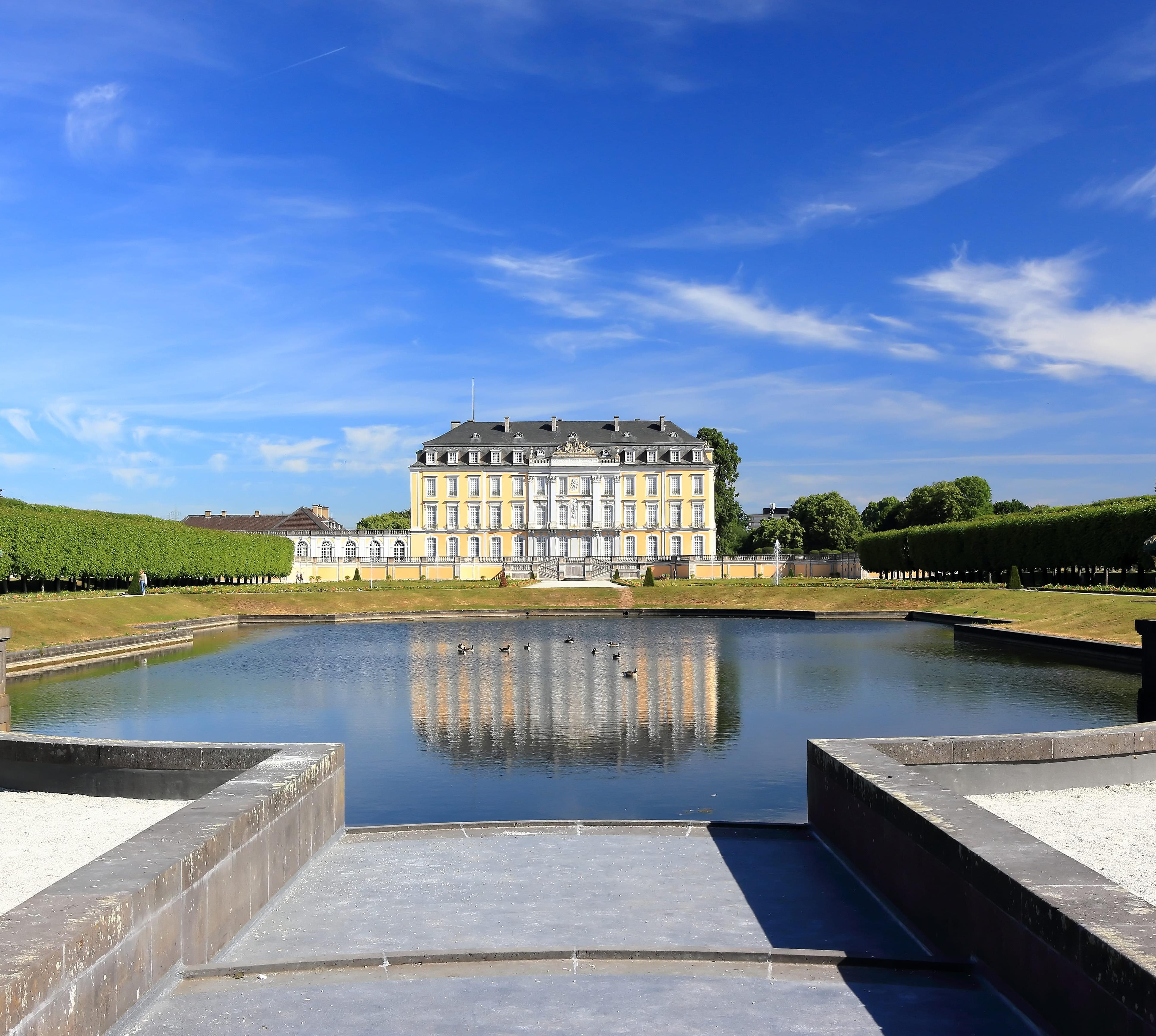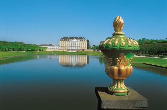 Was sich der französische König Louis XIV. an prachtvoller Architektur leistete, empfand auch der rheinische Kurfürst Clemens August für sich als standesgemäß. So ließ er seine alte Wasserburg in ein prunkvolles Lustschloss umbauen. Als kunsthistorisches Highlight gilt die Barocktreppe von Balthasar Neumann. Nach etwa 30 Minuten Fußweg durch eine idyllisch-romantische Lindenallee erreicht man das Jagdschloss Falkenlust.