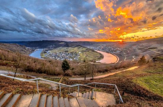 GeographicalPünderich ist einer der schönsten Fachwerkorte an der Mosel, der zudem nicht durch eine Straße vom Fluss getrennt wird. Zu den schönsten Häusern gehören das reich verzierte Fährhaus von 1621 und das gotische Rathaus von 1548.Das Hangviadukt ist mit seinen 97 Bögen eines der längsten Europas.