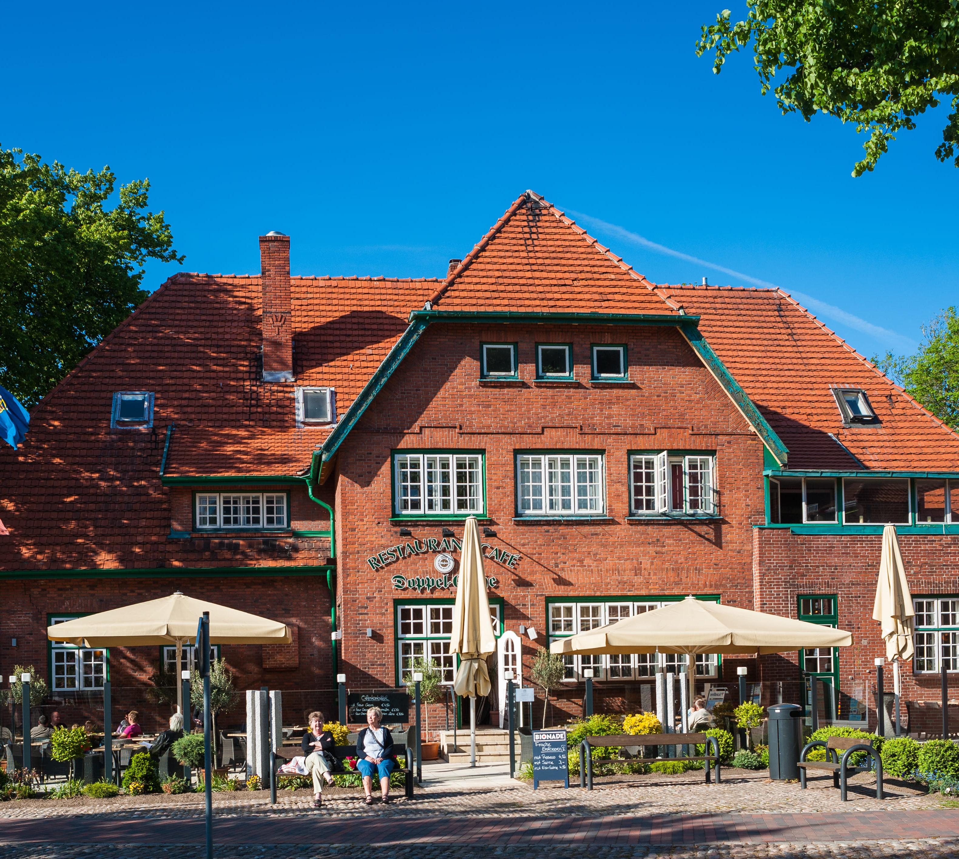 Das Fährhaus wartet mit einer Sonnenterrasse unter hohen Bäumen auf Gäste - ein schöner Platz für eine Rast mit Blick auf den Fährbetrieb und die vorbeifahrenden Schiffe.