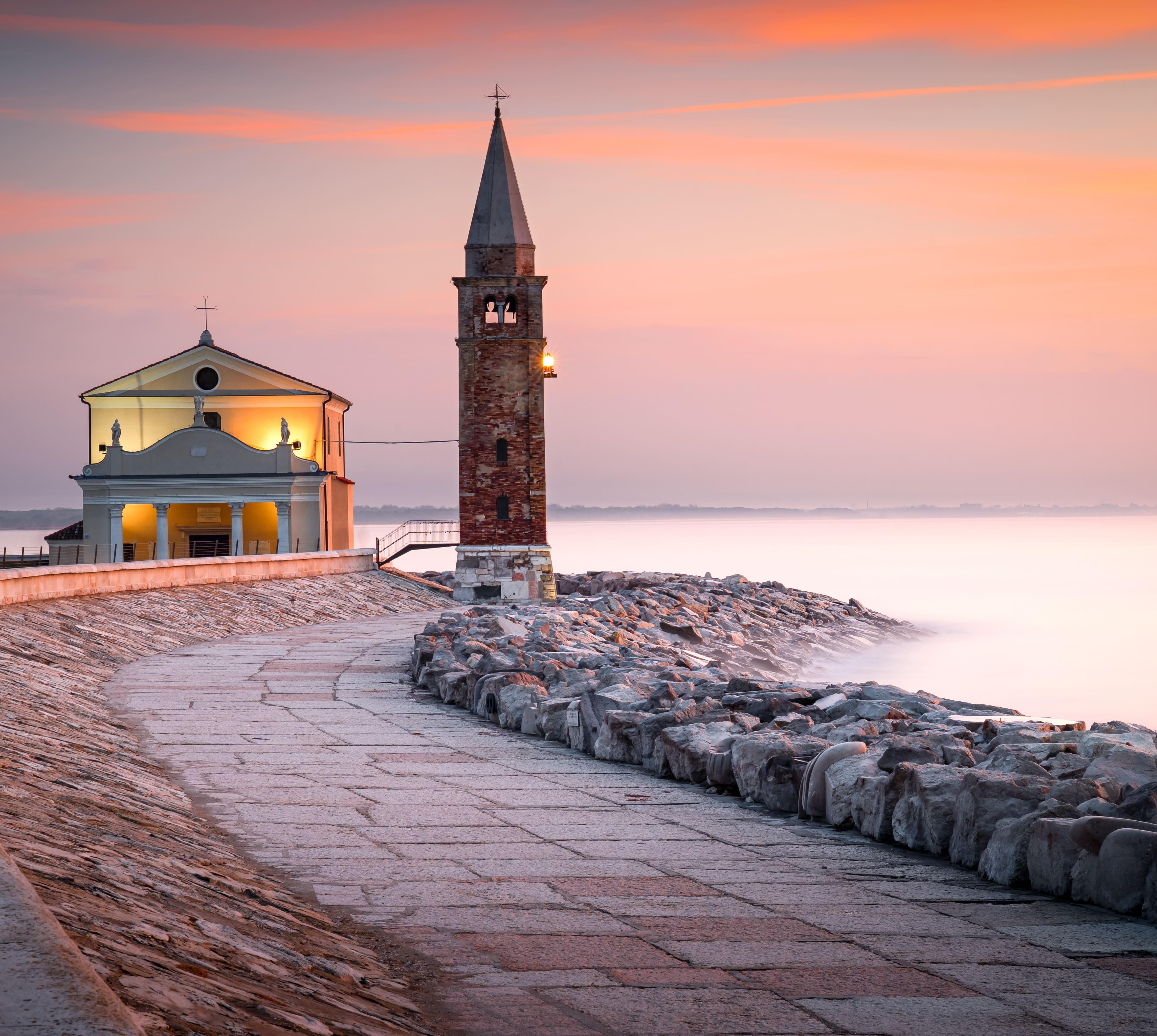 Caorle ist nach venezianischem Vorbild von inzwischen trockengelegten Kanälen durchzogen, die heute als handtuchschmale Gassen nostalgische Gefühle wecken. Im Kanalhafen am Canale dell’Orologio ankert die moderne lokale Fischfangflotte und dümpeln historische Fischkutter mit ebenfalls bunt bemalten Segeln. Die deichartig aufgeschüttete Strandpromenade Lungomare Venezia trennt die fischerromantische Altstadt vom Meer, wo sich entlang von Spiaggia di Ponente und Spiaggia di Levante Hotels, Feriensiedlungen und Campingplätze aufreihen. Das instagramtaugliche Ensemble der Chiesa Madonna dell’Angelo samt Glockenturm markiert das Ende der Promenade.