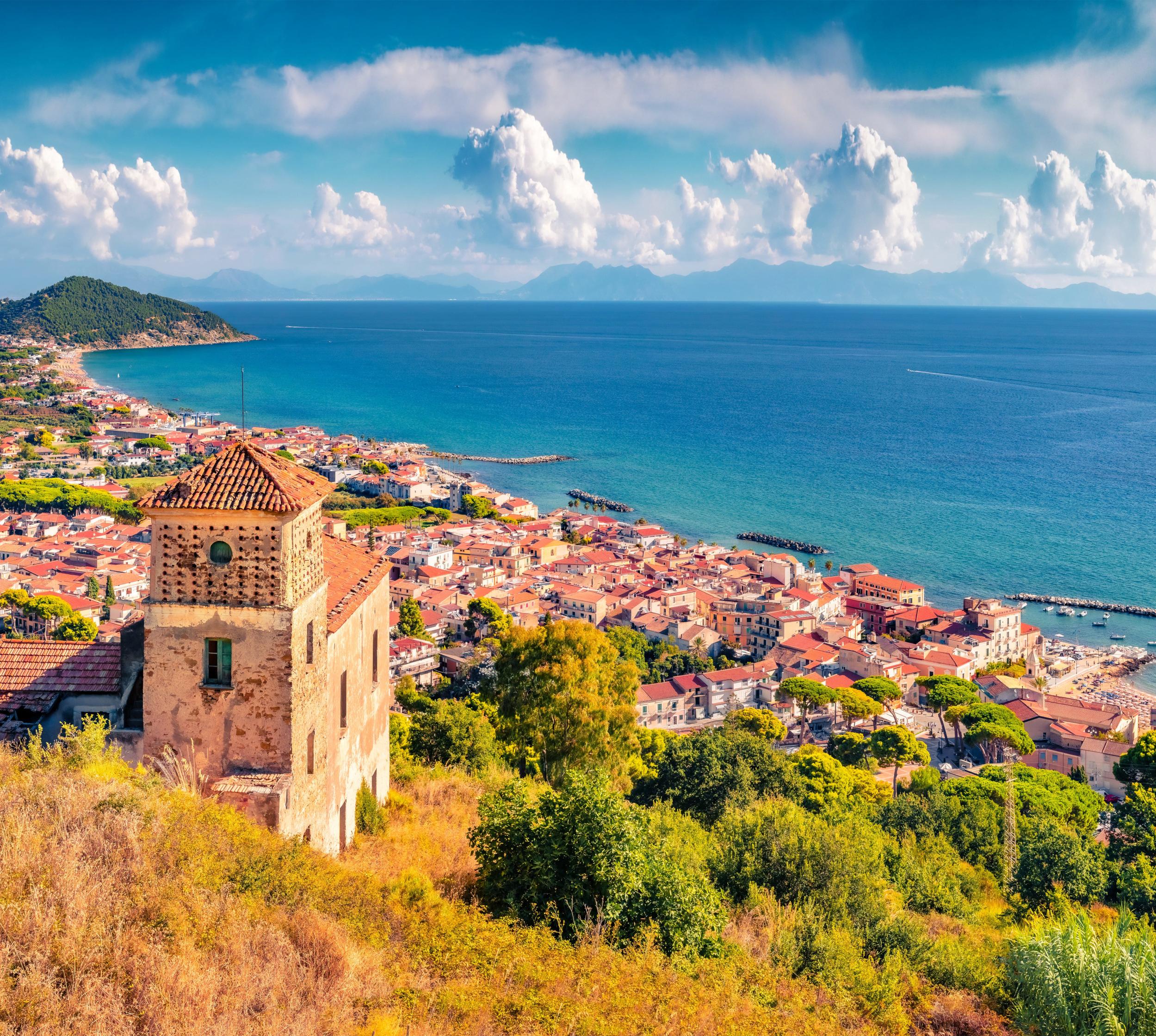 Auf einer Hügelkuppe drängt sich das alte Castellabate, ein bezauberndes mittelalterliches Zentrum mit einladenden Gassen und Häusern zum Entdecken. Manchmal geht es steil hinauf, mit bequemen Schuhen machen die bezaubernden Winkel mehr Spaß. Die beiden anderen Gemeindeteile, Santa Maria di Castellabate und San Marco, liegen mit ihren Fischerhäfen unten am Meer, an den Sandstränden der Bucht hin zur traumhaften Landspitze Punta Licosa im Süden.