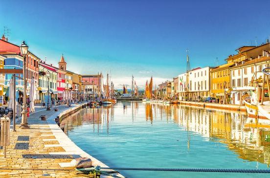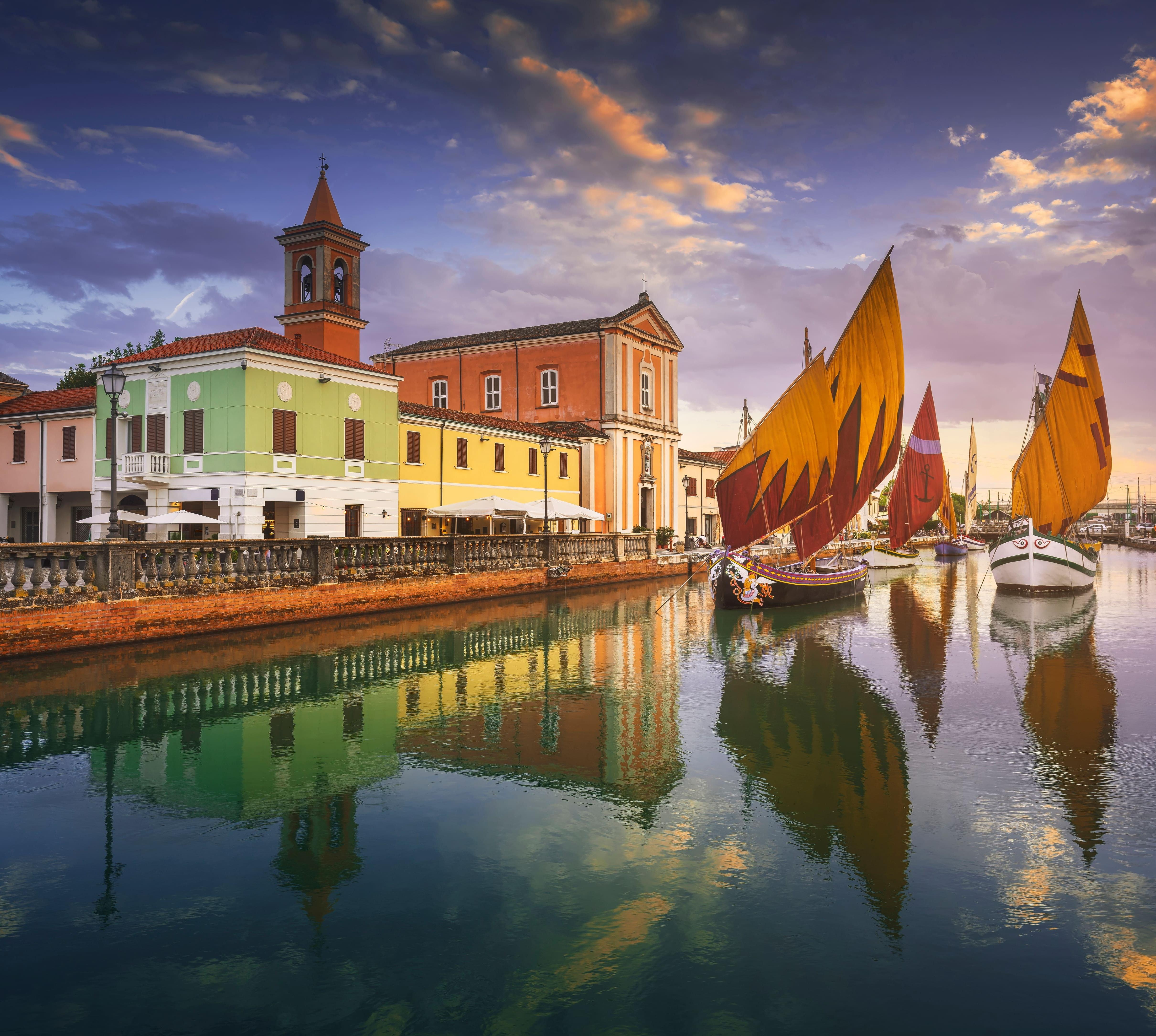 Die Anlage des Hafenkanals, der ca. 1 km in die Stadt hineinreicht, geht auf das 14.Jh. zurück und bezeugt die lange Tradition Cesenaticos als Fischerort. Seine heutige Gestalt erhielt er von Leonardo da Vinci um 1500.Über 100 pescherecci, die Schiffe der Fischereiflotte, laufen hier jeden Tag aus und ein. Rechts und links des Kanals beleben Bars und Restaurants die alten Fischer- und Händlerhäuser, tags über wie abends eine beliebte Flaniermeile. Schließlich der Höhepunkt, das Museo Galleggiante della Marineria: Im letzten Kanalteil mitten in der Stadt erheben sich die bunten Segel der historischen Schiffe, ein schwimmendes Museum und einzigartiges Schauspiel. Bragozze heißen sie oder traboccoli und man kann sich kaum vorstellen, dass manche Fischer noch bis in die Fünfzigerjahre mit ihnen ausfuhren. Zur Historie des Hafens gehören auch die conserve, große, kegelförmige, halb eingegrabene Eiskeller, in denen unter Schnee der Fisch konserviert wurde. Ihre Reste siehst du an der nahen Piazza delle Conserve.