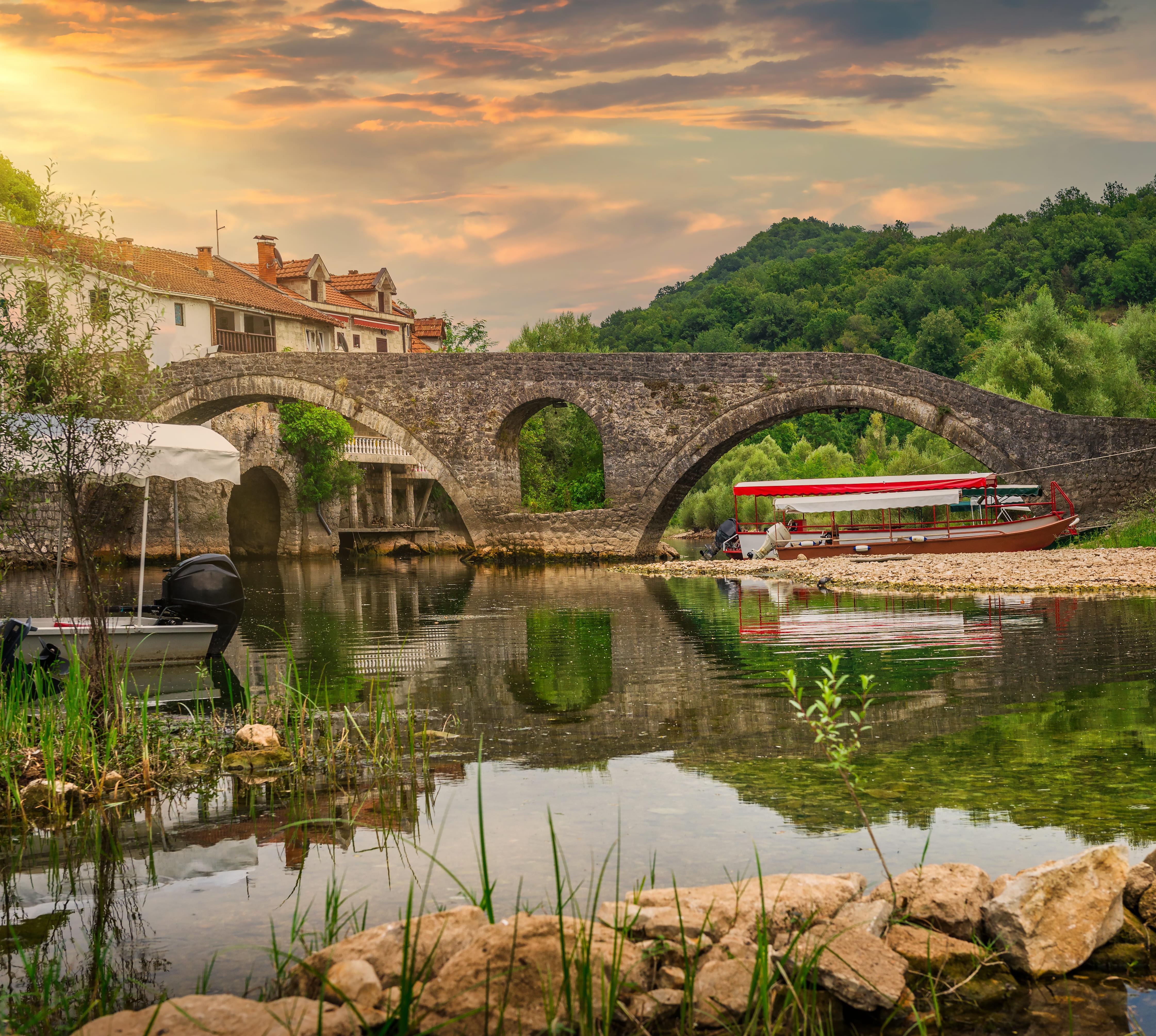 Der Blick von der Terrasse des Restaurants, das 1888 als Kaffeehaus eröffnet wurde, reicht über den Skutarisee bis nach Albanien. Probiere unbedingt das leckere, unter dem sač gegarte Lammfleisch