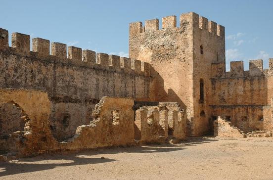 Die frei zugängliche Burganlage stammt aus venezianischer Zeit. Der Blick von der Burg, die ein beliebter Treff zur Zeit des Sonnenuntergangs ist, reicht bis nach Gávdos, der südlichsten Insel Europas.