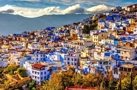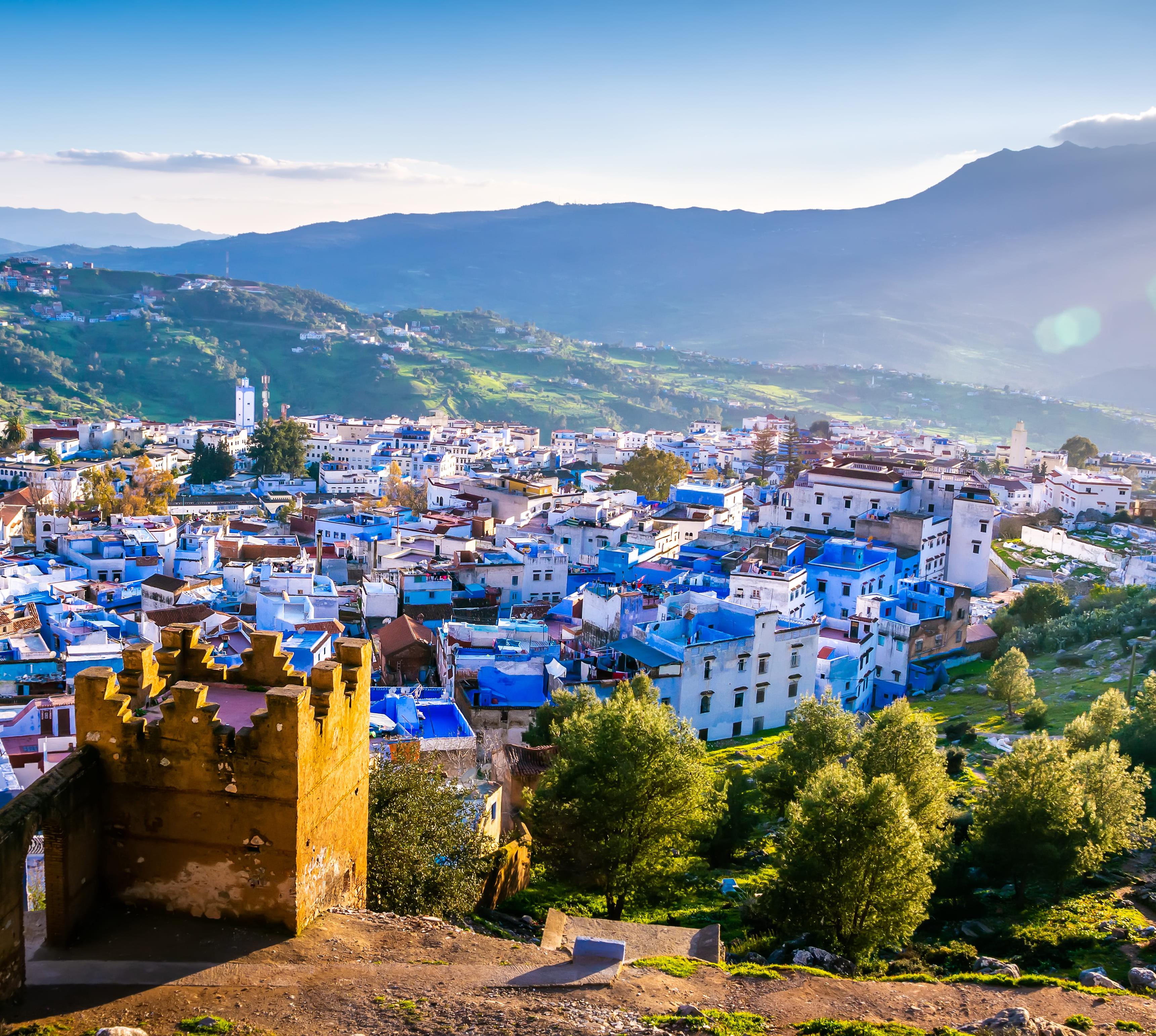 Der Ort gehört zu den malerischsten Zielen in Marokko: Pittoresk liegt er zwischen den Gipfeln des Jbel Kelaa und des Jbel Meggou auf 600 m Höhe. Der alte Ortskern ist durchzogen von kleinen Gassen mit weiß gekalkten Häusern und blauen Türen. Vor allem am späten Nachmittag ergeben sich phantastische Farbspiele. Die Stadt wurde im 15.Jh. von Muslimen gegründet, die aus Spanien im Rahmen der Reconquista geflohen waren. Bis 1920 war der Zutritt für Nichtmuslime verboten. Heute findet man hier vor allem jugendliches Publikum aus aller Welt, das die Atmosphäre der Stadt prägt.
