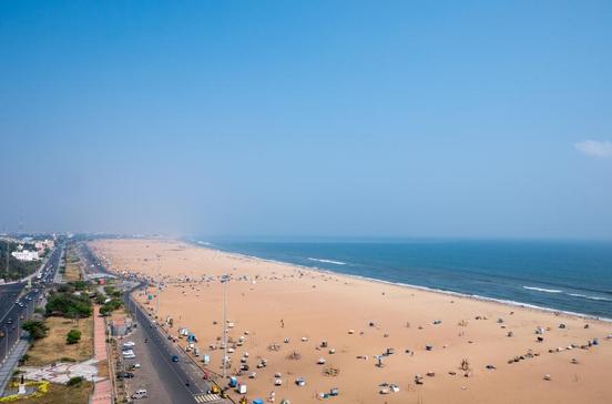 Der 12 km lange und bis zu 430 m breite Stadtstrand von Chennai zieht sich vom Fort St. George im Norden bis zur Velankanni-Kirche im Süden. Steinstatuen von berühmten Politikern, darunter Mahatma Gandhi, schmücken die Küstenstraße. Ein Spaziergang führt an einigen Kolonialbauten vorbei - etwa dem Senatshaus, der Universitätsbibliothek und dem Chepauk-Palast. Vom Baden wird aber abgeraten, dafür ist es hier nicht sauber genug.