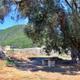 Restaurant in grüner Umgebung über Messongí mit Blick übers Meer und die Berge.