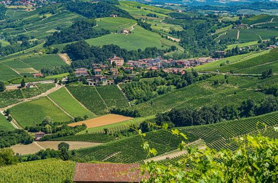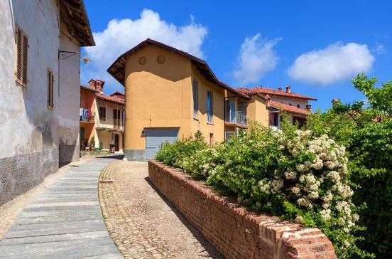 Durch die ersten Weinberge hinauf erreicht man Verduno, eines der Barolodörfer. Das hiesige Schloss war im Besitz Carlo Albertos, der im 19.Jh. ein Paradeweingut daraus machen wollte. Unterhalb des Schlosses liegt die schöne grasbewachsene Piazza Belvedere mit toller Aussicht über die Langhe.