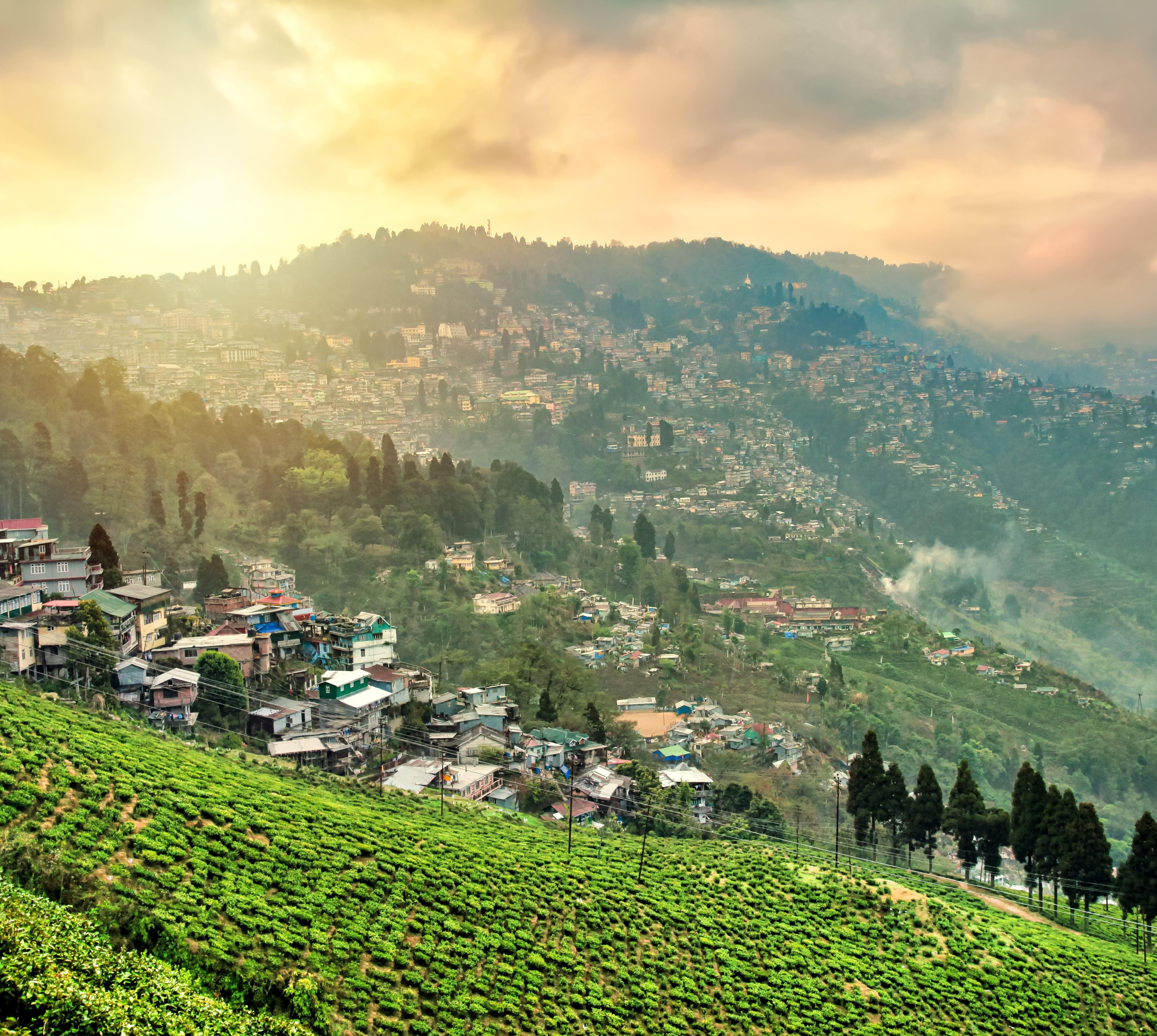 Die „Königin des Himalajas“ ist ein hoch gelegener Kultort für alle Teeliebhaber. Mehr als 80 Teeplantagen rollen ihre grünen Teppiche über Darjeeling aus. Dahinter blitzen die schneebedeckten Gipfel des Kanchenjunga-Massivs hervor.