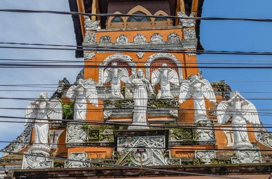 In dieser katholischen Kirche mischen sich christliche und balinesische Stilelemente: Die Engel tragen Sarongs.