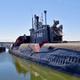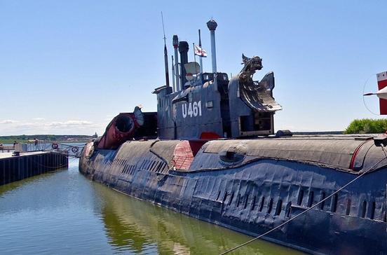 Den Hafen beherrscht das einstmals größte dieselbetriebene U-Boot der Welt. Den 1965 erbauten stählernen Riesen von 86 m Länge musterte die russische Kriegsmarine 1994 aus. Daneben wurde "Taucher II." vertäut, ein 1959 von der Volksmarine der DDR in Dienst gestelltes Taucherhilfsschiff. Aus der Räuchertonne auf Deck wird in der warmen Jahreszeit frisch geräucherter Fisch verkauft. Zu sehen ist noch der 1877 gebaute Dreimastschoner "Vidar", der als Gaststättenschiff dient.