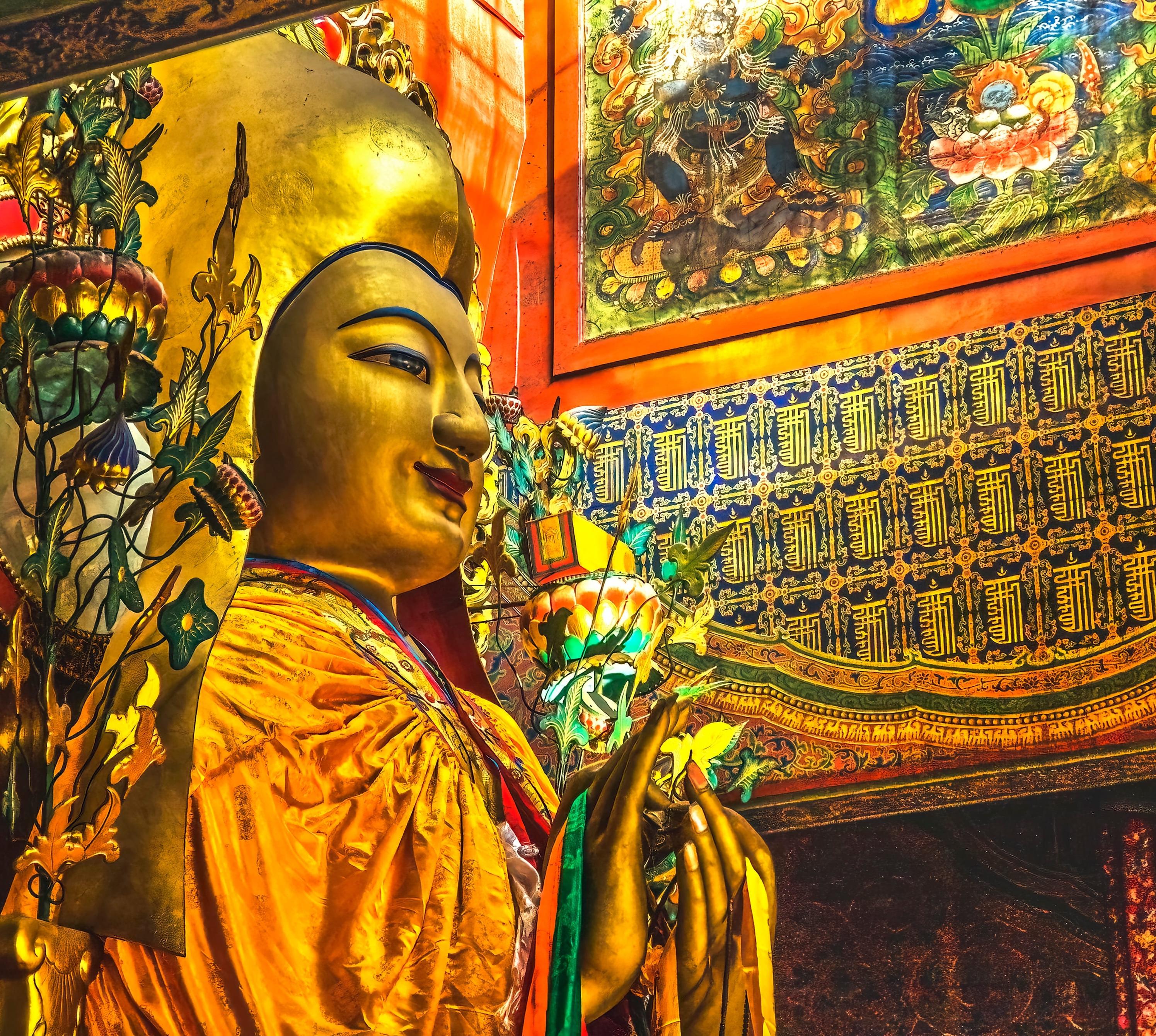 Der Lamatempel Yonghe Gong ist Pekings größtes und prächtigstes Tempelkloster - er zählt zu den allerersten Attraktionen der Stadt, auch wenn er erst 1744/1745 gegründet wurde. Dem Kaiserpalast oder dem Himmelsaltar hat der "Palast der Harmonie" sogar eines voraus: Er ist kein Museum, sondern wird noch von Mönchen bewohnt. Er war ein Projekt der Mandschu-Kaiser - die gelb glasierten Dachziegel zeugen davon. Um zu dokumentieren, dass das zuvor einverleibte Tibet und die ebenfalls lamaistischen Mongolen im Reich gut aufgehoben seien, mochte der Hof nicht knausern. Die Verbindung von tibetisch-mongolischem Lamaismus und chinesischer Kultur nimmt hier vielfache Gestalt an. Die Inschriftentafeln an den Hallendächern sind viersprachig: chinesisch, mongolisch, tibetisch, mandschurisch. Schon der Auftakt ist prunkvoll: Drei große Schmucktore umstehen den Vorplatz. Eine 160 m lange Zuwehung schafft Abstand zum Staub der Straße. Jenseits eines weiteren Tors überquert man einen Hof, auf dem Glocken- und Trommelturm sowie zwei Stelenpavillons stehen. In der ersten Halle, ganz chinesisch, zürnen die großartigen Wächtergottheiten der vier Himmelskönige dem Bösen. Dämonen winden sich unter ihren Füßen. In der Mitte lacht der Dickbauchbuddha die Eintretenden verheißungsvoll an, und rückwärtig wacht Weitum als Schützer der Lehre über das Tempelinnere. Den nächsten Hof schmücken ein gewaltiges Weihrauchgefäß, ein Stelenpavillon mit viersprachiger Inschrift "Der Lamaismus" von 1792 sowie eine Bronzeplastik des Weltenberges Meru, auf dem die Götter, die Bodhisattvas und die Buddhas wohnen. Deren Heiligkeit schaust du in den zwei nächsten Hallen. In der ersten thronen die Buddhas der Drei Zeitalter auf ihren Lotosblüten, flankiert von den 18 Luohan. In der folgenden Halle sitzen als weitere goldene Trias der Buddha des langen Lebens, der Medizinbuddha und der Buddha des Löwengebrülls, dessen Erweckungsruf weltweit vernehmbar ist.