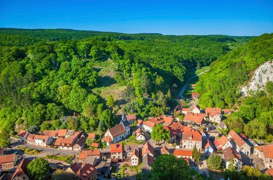 Das Dörfchen,12 km westlich, liegt idyllisch im engen Tal unter weißen Felswänden und bewaldeten Berghängen. Der Aufstieg zur Queste, einem hohen Gipsfelsen, wird belohnt mit einem einzigartigen Blick. Im Nachbarort ist das einstige Gut Drebsdorf zum Reiterhof ausgebaut worden.
