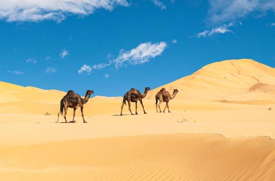 Dieser Name passt wie der Beduine aufs Kamel: Rub al-Khali bedeutet „leeres Viertel“, und in der mit 650 000 km² größten zusammenhängenden Sandwüste der Erde findet sich tatsächlich viel Nichts. Das aber ebenso majestätisch daherkommt wie die Dünen, die sich bis zu 250 m in den meist wolkenlosen Himmel erheben. Das Sandmeer bedeckt nahezu ein Viertel der Arabischen Halbinsel – und tatsächlich ist in seinem Zentrum, das in Saudi-Arabien liegt, ein Überleben nahezu unmöglich. Doch an den Randgebieten gibt es zwischen denn nachmittags orangerot leuchtenden Dünenzügen eine Handvoll kleinerer Oasen. Eine davon ist Hashmaan, etwa 250 km nördlich von Salalah gelegen, dort, wo die ersten Sandberge zu finden sind. Die hiesigen Beduinenfamilien verbringen die heißen Sommermonate in klimatisierten Häusern. Doch sobald es abkühlt, ziehen zumindest die Männer oft wieder in ein einfaches Zelt zwischen die Dünen. Eine kleine Quelle mit schwefelhaltigem Wasser versorgt ihre großen Kamelherden – die ein wunderbares Fotomotiv abgeben. Mit etwas Glück erlebst du sogar die Geburt eines kleinen Kamels. Bis zur Oase Shisr führt eine gute Asphaltstraße, die letzten 75 km nach Hashmaan sind Schotterpiste. Keine Übernachtungsmöglichkeit außer Zelten in den Dünen.