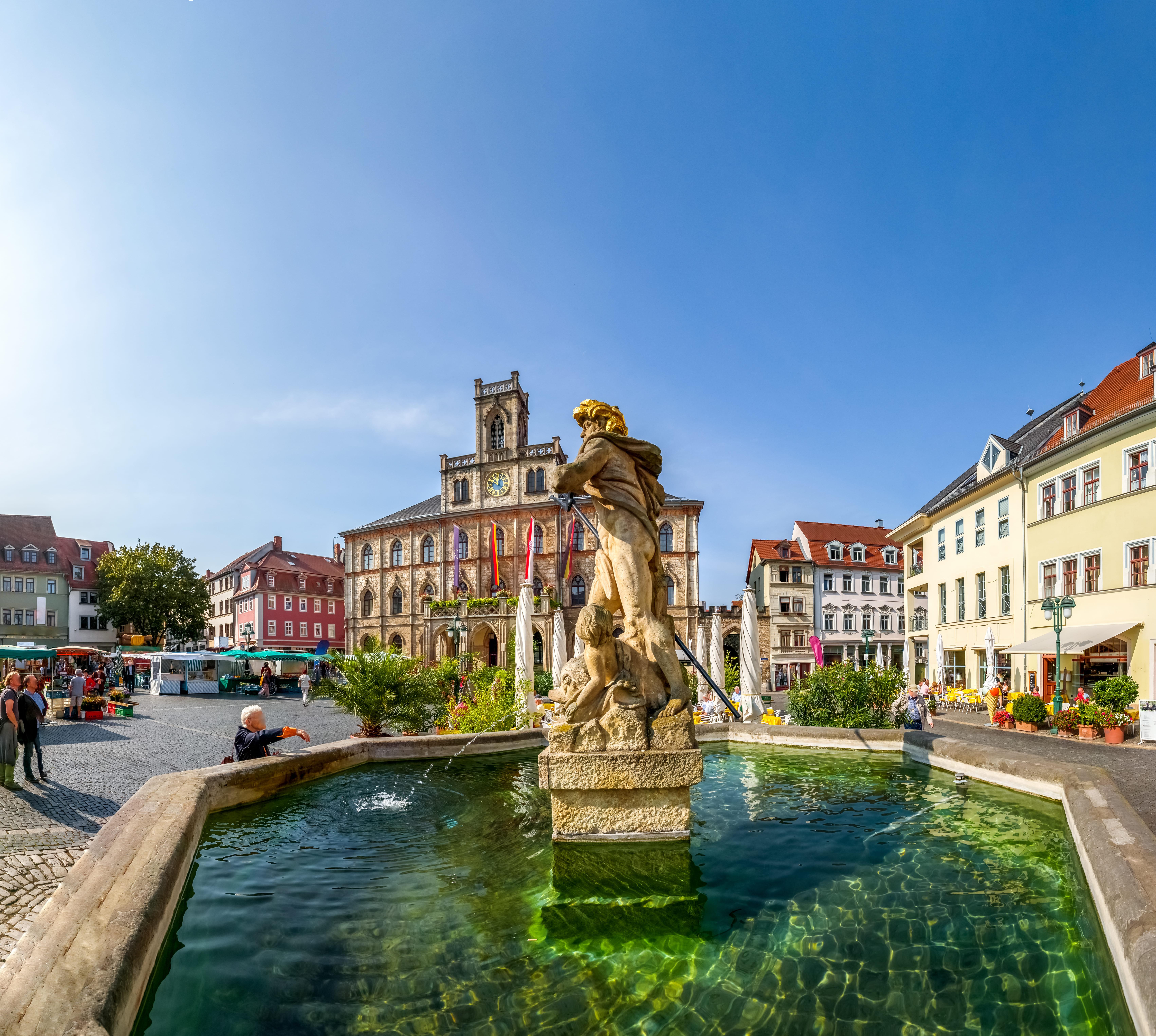 Die Wohnhäuser Schillers, Goethes oder der Familie Cranach stehen dicht beieinander. Palais reiht sich an Schloss reiht sich an Museum. Kopfsteingepflasterte Gässchen und Flaniermeilen, gesäumt von Läden und Restaurants, verbinden die wichtigen Plätze, wie den Markt und den Theaterplatz. Ringsherum stehen sanierte Altbauten. Auch wenn dieser Teil der Stadt fast vollständig verkehrsberuhigt ist, sorgen die Touristenmassen dafür, dass hier viel Trubel ist.