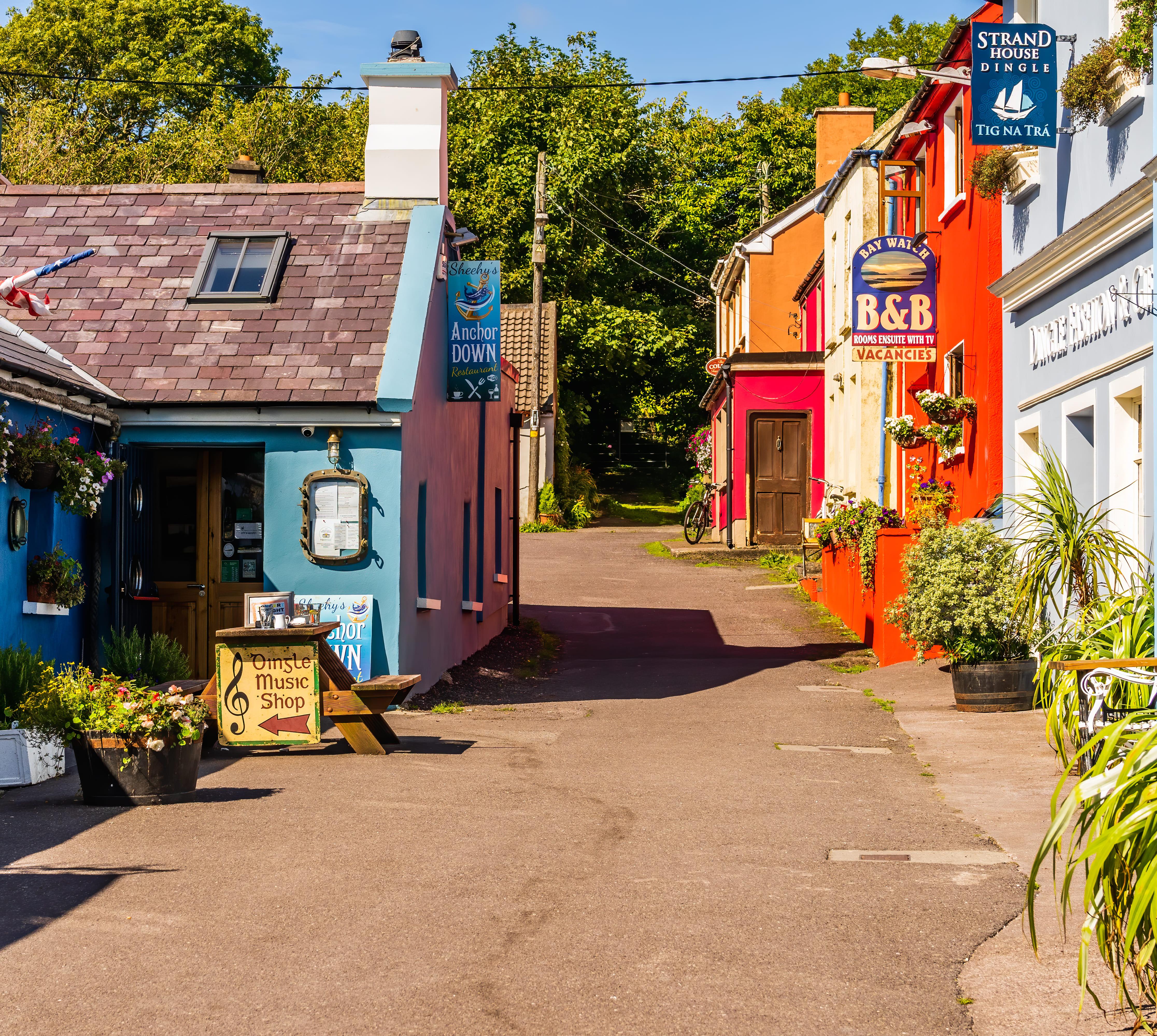 Knallbunte Häuser, reetgedeckte Kneipen: der kleine Fischerort Dingle (2000 Ew.) ist das Zentrum der Halbinsel. Hier gibt es auch einige der besten Restaurants der Insel. Was Eric und Jean Marie im Out of the Blue aus dem Fang zaubern, den die Fischer ihnen bringen, ist genial. Bestes Seafood, Sahne und Knobi landen im Chowder (Eintopf) und werden von gebuttertem, frischem Sodabrot ergänzt. Dazu sitzt man im Freien mit Blick auf den kleinen Hafen von Dingle. Perfekt! Und: In Dingle wird gefeiert. „It was great Craic“ heißt es am Morgen danach, also: Man hatte mordsmäßig Spaß in den Pubs und Pinten. Vielleicht hast du dich auch verliebt in die ausgelassene Atmosphäre des Städtchens? Warum nicht länger bleiben? Dann wäre Zeit genug, einen Bootsausflug zu machen. Mittlerweile ohne den handzahmen Delphin Fungi, der mehr als 30 Jahre in der Bucht lebte, 2020 jedoch verschwand. Ein Muss ist der 30 km lange Slea Head Drive, zwar super kurvenreich, dafür mit spektakulären Ausblicken auf den wilden Atlantik. Die Straße führt zur Landzunge Slea Head und deren Strand – so einsam und schön, dass der britische Star-Regisseur Sir David Lean sie für „Ryan’s Daughter“ als Filmkulisse wählte.