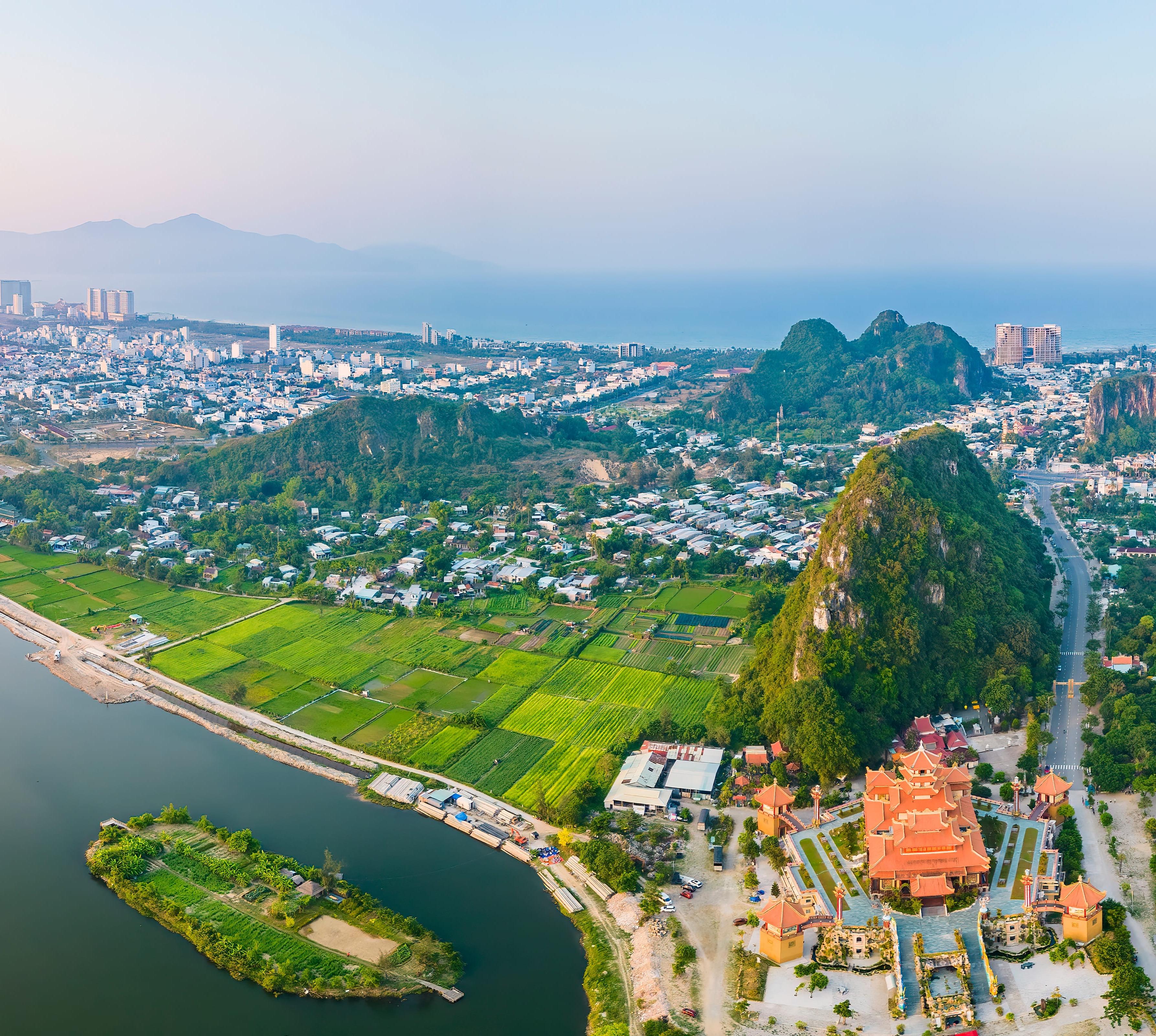 Südlich von Da Nang ragen aus einer Ebene diese fünf Berge bis zu 100 m steil auf. Sie sind nach den fünf grundlegenden Elementen der chinesischen Philosophie benannt: Thuy (Wasser), Tho (Erde), Kim (Metall), Moc (Holz) und Moa (Feuer). Einer Legende zufolge sollen sie Eier eines riesigen Drachens sein. Der bekannteste ist der Thuy Son, der Wasserberg, von dessen Gipfel man am Aussichtspunkt Vong Giac Dai einen phantastischen Blick über den Strand, das Meer und die anderen Berge hat. Bei einem Rundgang lernt man die früher von den Cham genutzten Grotten kennen. Beeindruckend sind die Tam-Tai-Pagode und die rund 30 m hohe Grotte Huyen Khong, in der zahllose Räucherstäbchen an der Statue des Thich Ca (Buddha der Gegenwart) brennen. Es entsteht ein stiller, feierlicher Zauber, wenn Sonnenstrahlen golden durch das Höhlendach hindurchscheinen und die Betenden sich andächtig vor dem Buddha verneigen. Von Tang Chon, der letzten Höhle, führt der Weg hinab zur Linh-Ung-Pagode und in das Dorf Quang Nam, wo man Marmorsouvenirs kaufen kann.