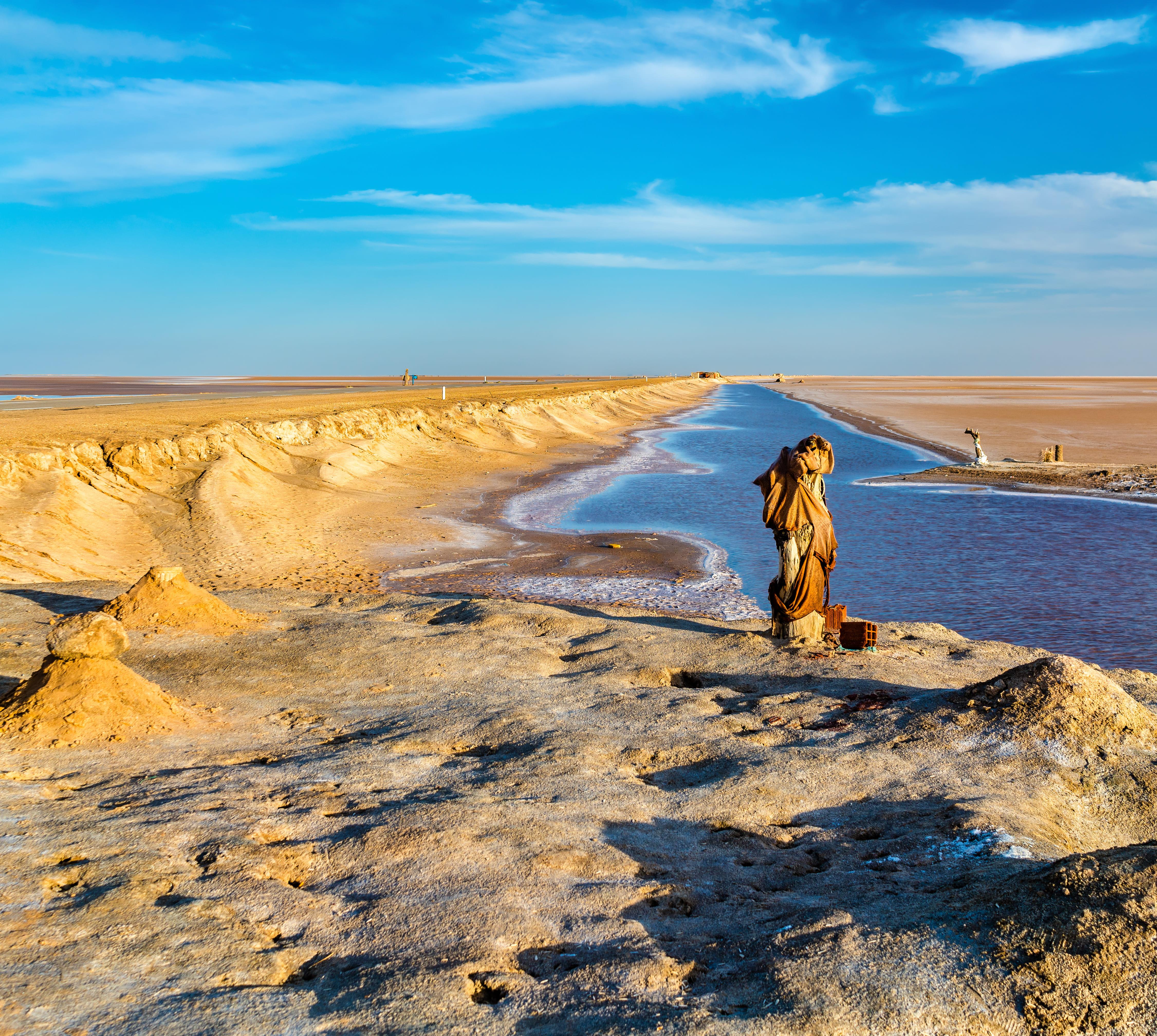 Südlich der Berge bestimmen Wüstensteppen und die abflusslosen Salztonsenken, die Chotts, das Bild. Karl May hat dem deutschsprachigen Publikum die Tücken des riesigen Salzsees Chott el Jerid in "Durch die Wüste" nähergebracht. Heute wird der Chott auf einer gut ausgebauten, schnurgeraden Straße überquert. Doch die Einöde und das flirrende Licht beeindrucken nach wie vor.