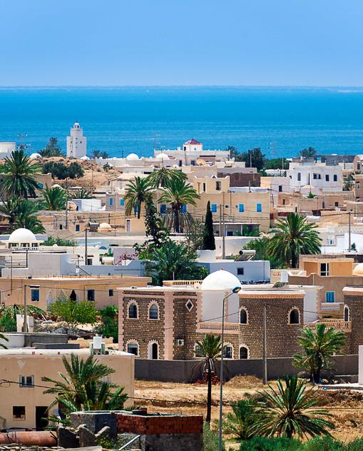 Mit rund einer Million Dattelpalmen, den Minaretten, die in den blauen Himmel ragen, und uralten Olivenbäumen bietet Djerba heute eine Urlaubsidylle zum Abschalten. Das 514 km2 große, flache Eiland mit seinen 130000 Einwohnern ist umsäumt von weiten Stränden. Und während es an der Ostküste mit Reiten, Tauchen und Pilates am Pool modern und touristisch zugeht, wird an der einsamen Westküste der Fisch noch auf altbewährte Weise mit kleinen Booten gefangen. Die weiße Tracht der Frauen ändert sich von Ort zu Ort und es ist nichts Ungewöhnliches, dass eine Braut im Jehaf (Hochzeitszug) auf einem Kamel, begleitet von Musikern, vorbeizieht. Tradition ist auf Djerba eben nicht nur Folklore. Sie ist lebendig.