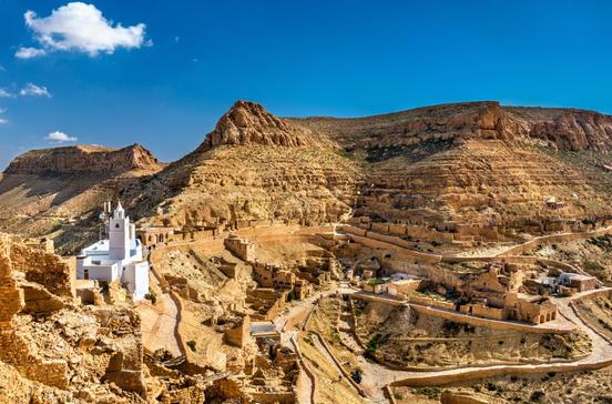 Etwa 12 km hinter Matmata, auf der Straße nach Douz, liegt das Berberdorf Tamezret (800 Ew.) wie eine weiße Festung im Berg. Die engen Gassen sind nur zu Fuß begehbar. Die Regierung versucht, den Ort am Leben zu erhalten. Viele Männer von hier zogen in die Städte des Nordens, was Tamezret zu einer Stadt der Frauen und Kinder gemacht hat. Bevor du die Stufen zum Café Berbère oben im Dorf hinaufsteigst, besuch doch das kleine Berbermuseum. Es zeigt ausgewählte Tücher und Teppiche der Berber. Zudem kann man dort die besondere Ar-chitektur des Orts studieren: die Verbindungen der in Stein gehauenen Häuser untereinander, die im Fall eines Angriffs auch als Fluchtwege dienten. Der Initiator des Museums, Mongi Bouras, führt dich gern durch das liebevoll gestaltete Haus. Er kennt die Geschichte der Berber und der Region. Oberhalb des Museums betreibt er ein kleines Restaurant – ein lohnender Stopp.