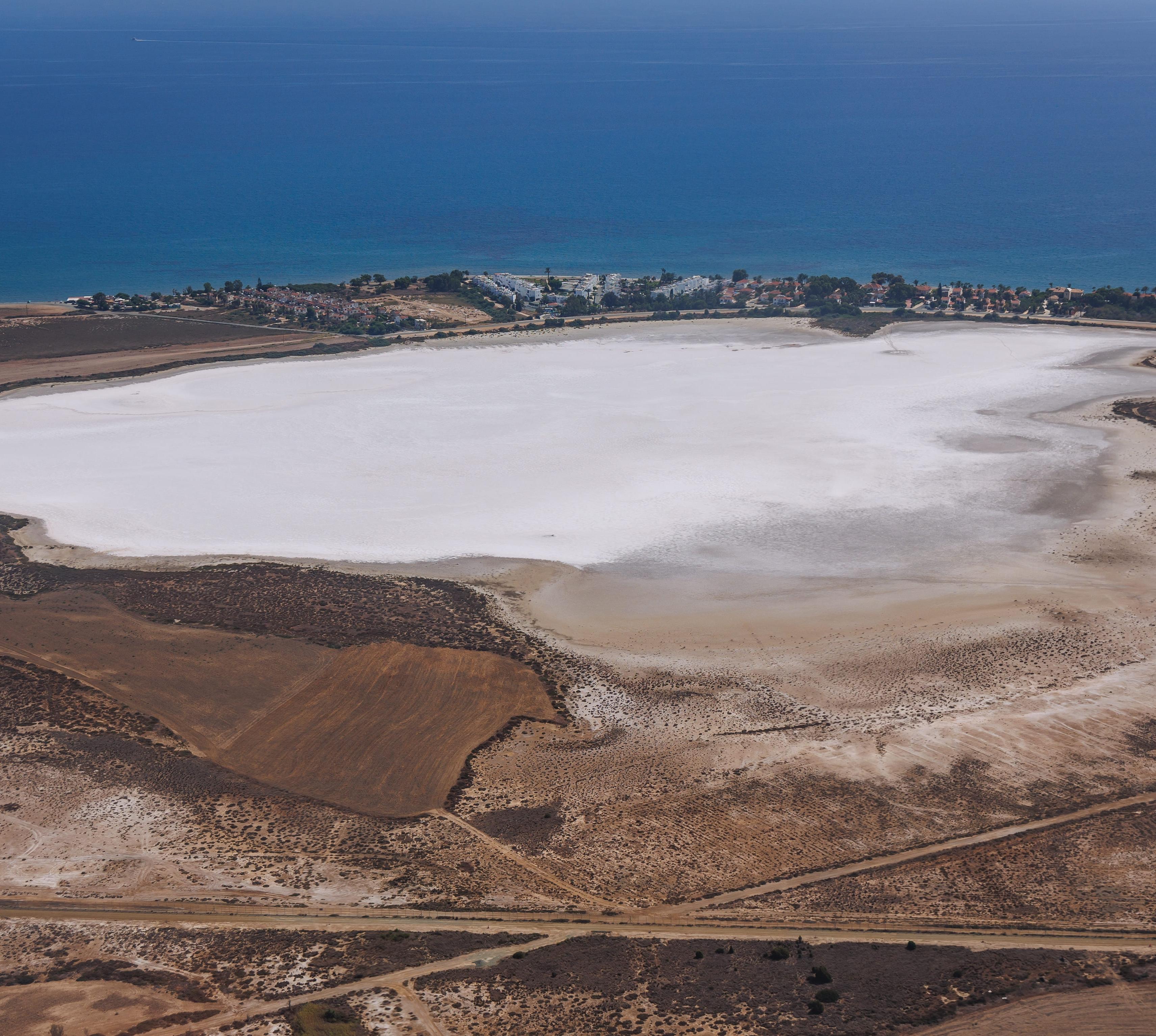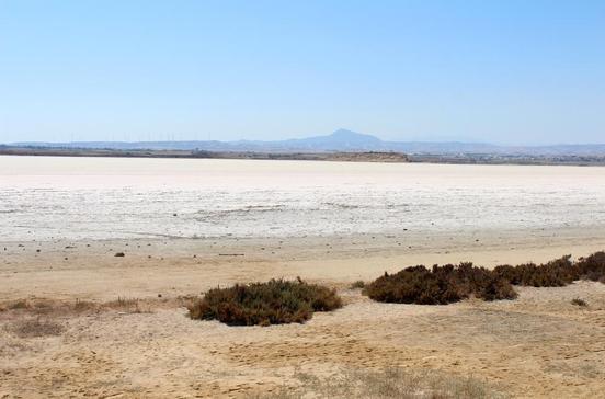 Der Salzsee von Lárnaka, in dessen flachem Wasser im Winter meist Flamingos stehen, trocknet im Sommer aus, und die Salzkruste glitzert in der Sonne wie Schnee.