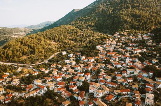 Im größten Bergdorf der Insel (1000 Ew.) stehen noch viele traditionelle Häuser. Vor allem am späten Nachmittag ist der von alten Platanen beschattete Dorfplatz mit seinen guten Tavernen voller Leben.