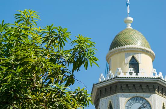 Historischer Glockenturm an der Promenade des Rio Guayas. Der Turm hat einen achteckigen Grundriss und vier Stockwerke. Den Abschluss des 23 Meter hohen Turmes bildet eine Kuppel in byzantinischer Bauweise.
