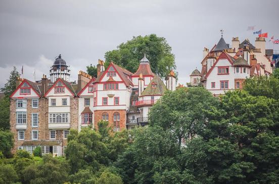 Die oktagonalen, weißen Gebäudetürme mit schottischen Baronial-Stilelementen aus dem 18.Jh. sind schön mit roten Sandsteinbändern abgesetzt.