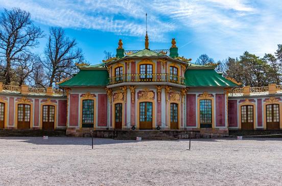 Am Ende des Schlossparks Drottningholm liegt Kina Slott, ein chinesischer Pavillon mit Pagodendach, Lackmöbeln und Seidentapeten, der 1753 gebaut wurde und den schwedischen Königen als Lustschloss diente.