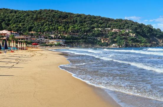 Der fast 2 km lange Sandstrand führt vom Ortskern im Südwesten bis zu einem schattigen Pinienwald im Osten. Es gibt zahlreiche Bars, Badeanstalten, Segel- und Tauchschulen.