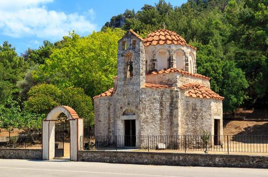 Die kleine Kirche des "heiligen Nikolaus von den Haselnüssen" liegt mitten in den Feldern an der Straße, die von Eleoússa aus auf den Profítis Ilías führt. Sie stammt aus dem 14.Jh. und war ursprünglich die Hauptkirche eines Klosters, von dem aber sonst nichts erhalten geblieben ist. Gestiftet wurde es von einem hohen byzantinischen Beamten auf Rhodos. Er ist zusammen mit seiner Frau auf einem Fresko neben der westlichen Eingangstür dargestellt. An der gegenüberliegenden Wand sind die drei Kinder des Paars abgebildet. Eine Inschrift verrät, dass sie nahezu gleichzeitig - wohl an einer Seuche - starben. Nur ein paar Schritte entfernt befindet sich eine Wasserstelle. Ein Tisch und zwei lange Bänke unter Bäumen laden zu einer Rast ein.