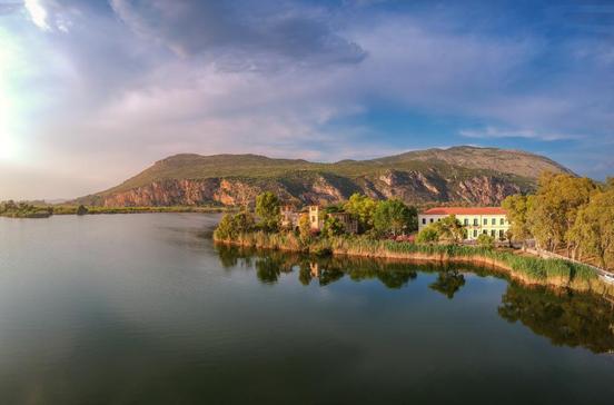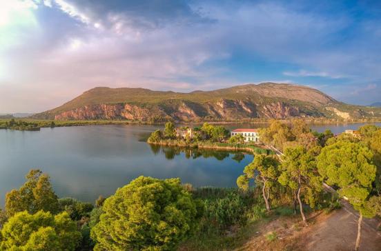 Rund um Kaiáfas 25 km südlich von Olympia hat es im Sommer 2007 besonders heftig gebrannt. Die Wälder an den Berghängen am Ostufer des Sees und sogar die Bäume auf den Dünen am Strand wurden vernichtet, aber der alte Pinienwald auf der über einen kurzen Damm von der Nationalstraße her erreichbaren Insel mit dem alten Kurhaus blieb in voller Schönheit erhalten. Thermalbäder nimmt man heute im neuen Kurhaus am Ostufer des Sees.