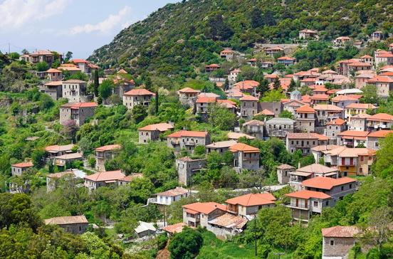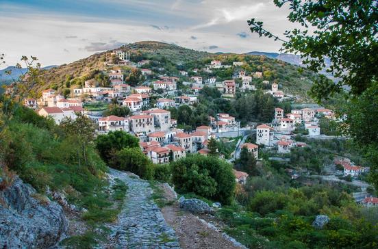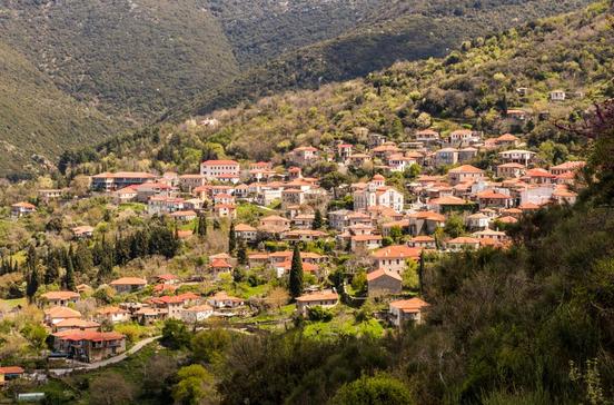 Wer hier wohnt, braucht gute Kondition. Die aus Naturstein erbauten Häuser des Dorfs liegen an einem unglaublich steilen Berghang über mehrere Hundert Höhenmeter verstreut. Treffpunkt der knapp 400 Ew. sind die schmalen Aussichtsterrassen an der Hauptstraße, die das Dorf etwa in halber Höhe durchschneidet. Hier kannst du im Restaurant Maniátis wie ein Bergbauer essen. Zu den Spezialitäten zählen Hähnchen in Weinsauce mit regionalen Nudeln, Schweinefleisch mit Maronen und stifádo vom Hirsch. Übernachtungsgäste können hier an vielen Tagen sogar am Teigkneten und Brotbacken teilnehmen. Eine Riesenauswahl an kulinarischen Naturprodukten aus eigener Herstellung bietet Kanélla Mouroútsou in ihrem Geschäft an der Platía.