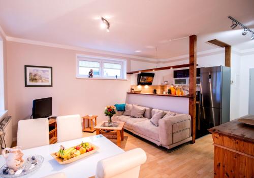 Neben den hellen Zimmern bietet die GRÜNBLAU RELAX Pension & Apartments komplett eingerichtete Apartments mit einem geräumigen Wohn- und Schlafbereich.