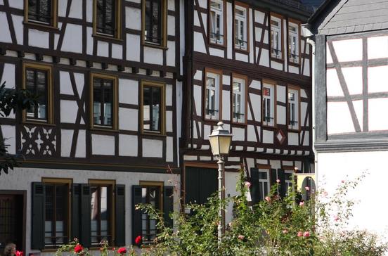 Weinranken und -reben, Blattornamente in vielfacher Ausprägung: Die Gefachbemalungen der Fachwerkhäuser sind einzigartig im Rheingau, da diese künstlerische Ausdrucksform in der Region keine Tradition hat. Zum Ensemble der Häuser in der Hauptstraße und im Burggraben gehört das älteste Fachwerkhaus des Stadtteils: Der Giebelbau in der Hauptstr. 36 ist fast 500 Jahre alt.