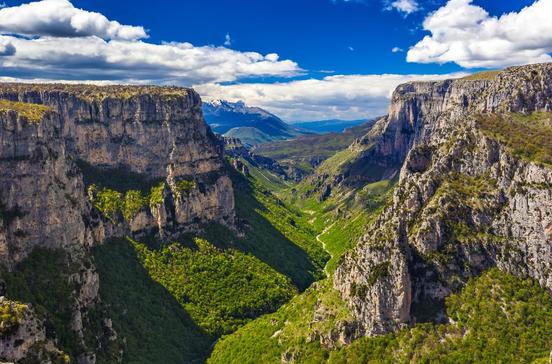 Hochgebirge und tiefe Täler prägen die Landschaft zwischen albanischer Grenze und Amvrakischem Golf. Wildwasserflüsse und Schluchten fordern zu Aktivitäten heraus, Dörfer wie aus der Zeit gefallen sind ideal zum Relaxen. Aber auch Meer gibt’s für ein paar Tage am Strand, Inselausflüge inklusive. Das Naturerlebnis steht im Epirus an erster Stelle. Der Nationalpark Víkos-Aóos ist der zweitgrößte des ganzen Landes. An vielen Straßen warnen Schilder vor kreuzenden Braunbären, kreisende Greifvögel gehören zum Luftbild. Im Amvrakischen Golf sind Delfine, Flamingos und Pelikane zu Hause, auch Meeresschildkröten schwimmen herum. Manchmal gewinnt das Naturerlebnis sogar eine historische Dimension: Aus einer Eiche im antiken Heiligtum von Dodóna sprach einst Zeus zu den Menschen. Und der Ácheron galt alten Griechen und Römern als Grenzfluss zum Totenreich.