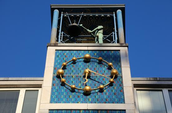 Es war und bleibt ein Wahrzeichen von Essen: Seit vielen Jahrzehnten erklingt dieses Glockenspiel. Jeweils zur vollen Stunden schlägt der Bergmann gegen die Glocke.