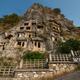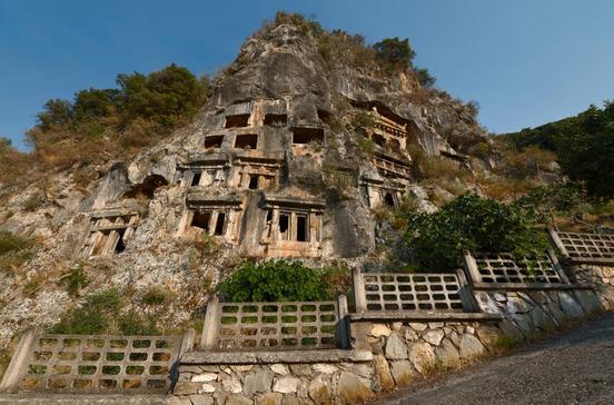 Das lykische Königsgrab der Region thront hoch über der Stadt (220 Stufen!). Es weist eine vorgebaute, 15 m hohe ionische Tempelfassade und ein in Stein nachgeahmtes Holzportal auf. Die Lykier bestatteten ihre Toten in erhöhten Felskammern, da sie glaubten, dass die Seelen der Verstorbenen von Sirenen in den Himmel getragen würden. Der Aufstieg ist ausgeschildert.