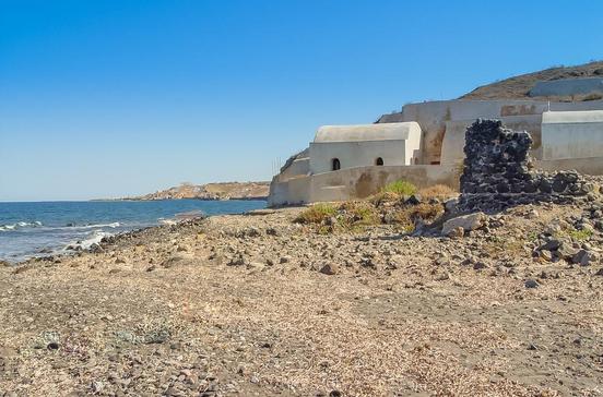 Wenn du mutig und schwindelfrei bist, ist die markante, von vielen Stellen am Kraterrand gut erkennbare Lavaknolle unterhalb von Imerovígli ein Ziel für dich. Die in den Krater hineinragende Formation trug während der venezianischen Zeit von 1207 bis zur Mitte des 16.Jhs. die Inselhauptstadt. Sowohl die weltlichen Herrscher als auch der römisch-katholische Bischof der Insel lebten hier in ihrer jeweiligen Burg. Den Türken war der Standort auf dem bröckeligen Gestein zu unsicher, sie gaben die Siedlung auf. Ihre letzten Bewohner zogen 1811 nach Imerovígli und ins neu gegründete Firá um, Burgen und Wohnhäuser verfielen. Das Erdbeben von 1956 richtete weitere Schäden an, sodass von der einstigen Besiedlung heute nur noch kümmerliche Spuren erhalten sind. Von der auf einer schönen Aussichtsterrasse erbauten Kapelle Ágios Geórgios aus kannst du auf einem Pfad, der am Restaurant Blue Note beginnt, zunächst abwärts steigen und nach der Überquerung eines Sattels dann wieder auf den Skáros hinauf. Ganz Mutige gehen sogar bis zur kleinen Kapelle Agía Theosképasti, die sich auf der Rückseite der Kuppe ans Gestein schmiegt.