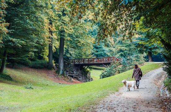 Unebene Grasflächen, Sträucher und seltene Bäume – darunter eine gewaltige Blutbuche –, Brücken schwingen sich über kleine Schluchten und mittendrin eine Schlossruine: Ein bisschen wie aus einem Märchen wirkt das alles. Doch natürlich ist der Park mühevoll angelegt worden, ganze 50 Jahre, von 1880 bis 1930, hat es gedauert, die 70 000 m² zu gestalten. Heute kannst du beim Spaziergang durch den Rosengarten über die Wiese mit den knorrigen Apfelbäumen und dem ummauerten Gemüsegarten vorm Schloss überlegen, welches von Grimms Märchen hier spielen könnte. Weitere Inspiration liefert ein Tal mit wilder Vegetation um Weiher, auf denen sich Enten, Gänse und Schwäne tummeln. Das Europäische Skulpturenzentrum stellt im Park monumentale Werke auf.