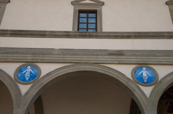 In Brunelleschis Findelhaus wurden seit 1445 ungewollte Kinder durch die Drehtür an der linken Schmalwand der Loggia geschoben - bis ins Jahr 1875! Das Gebäude mit den Rundbildern der Wickelkinder aus Terrakotta (Andrea della Robbia) beherbergt heute das MUDI - Museo dello Spedale degli Innocenti mit einer reichen Sammlung von Gemälden und Fresken des 14.-19.Jhs.