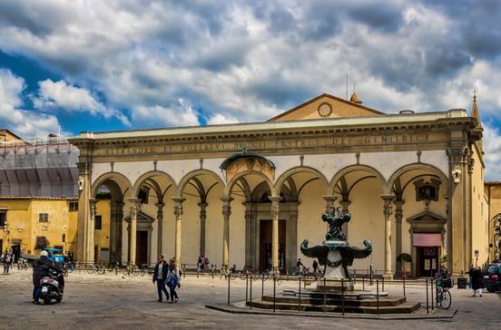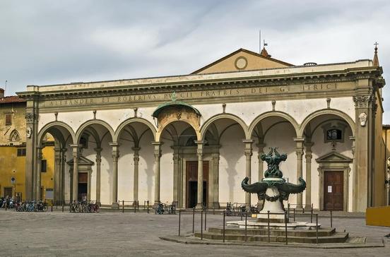 Der harmonisch gestaltete Platz mit einem Reiterstandbild Ferdinands I. von Giambologna und einem phantasievollen Brunnen von Pietro Tacca ist an drei Seiten von Arkadenreihen umgeben: im Norden das Vorhaus der Kirche Santissima Annunziata, an der Westseite der Säulengang des Spedale degli Innocenti, das Filippo Brunelleschi 1419 im Auftrag der Seidenhändler errichtete, und auf der gegenüberliegenden Seite die von Antonio da Sangallo errichtete Loggia. In Brunelleschis Findelhaus wurden seit 1445 ungewollte Kinder durch die Drehtür an der linken Schmalwand der Loggia geschoben - bis ins Jahr 1875! Das Gebäude mit den Rundbildern der Wickelkinder aus Terrakotta (Andrea della Robbia) beherbergt heute das Museo degli Innocenti mit einer reichen Sammlung von Gemälden und Fresken des 14.-19.Jhs.