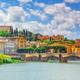 Die "Alte Brücke" ist eines der Wahrzeichen von Florenz. Schon zu Zeiten der Etrusker bestand ein Flussübergang, in römischer Zeit verlief hier die Via Cassia, einer der wichtigsten Handelswege Roms gen Norden. Die jetzige Brücke, die den Fluss an seiner schmalsten Stelle überquert, wurde 1345 von Neri di Fioravanti oder Taddeo Gaddi errichtet. Charakteristisch sind die überhängenden Brückenläden. Von 1422 bis 1593 betrieben hier hauptsächlich Schlachter ihr Geschäft. Als die großherzogliche Familie in den Palazzo Pitti gezogen war, störte sie der Geruch, und Ferdinand I. verfügte, dass fortan nur noch Gold- und Silberschmiede auf der Brücke ihr Handwerk ausüben durften. Damit er trockenen Fußes vom Palazzo Vecchio zum Palazzo Pitti gelangen konnte, beauftragte 1565 Cosimo I. seinen Architekten Giorgio Vasari mit dem Bau des Corridoio Vasariano, der über den Läden der Ostseite entlangläuft. Der Ponte Vecchio blieb als einzige Brücke beim Rückzug der Deutschen von der Sprengung 1944 verschont. Stattdessen wurde sie mit den Trümmern umliegender zerstörter Gebäude versperrt. Heute ist die Brücke mit ihren Juwelierläden einer der Anziehungspunkte der Stadt.