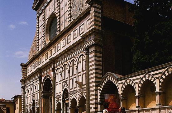 "In der ehrwürdigen Kirche Santa Maria Novella ...", beginnt das erste Kapitel aus Boccaccios Decamerone, einer Geschichte, die zur Zeit der Pest spielt, welche im 14.Jh. in Florenz grausam wütete. Die Überlebenden stifteten zahlreiche Kapellen der Kirche. Dieser erste gotische Bau der Stadt entstand 1246-1300.Die Außenmauern sind nach Art des Baptisteriums mit weißem und grünem Marmor verkleidet. Der obere Teil der Fassade wurde allerdings erst 1470 mit Mitteln des Florentiner Kaufmanns Giovanni Rucellai vollendet. Auch das Innere dieser Kirche verdient eine eingehende Betrachtung. Die großen Freskenzyklen zeigen auch den Wohnstil und die Mode des 15.Jhs. Zu den schönsten gehören in der Hauptchorkapelle (1486-90) die Szenen Domenico Ghirlandaios aus dem Leben Mariä, die Fresken der Cappella Strozzi rechts neben dem Hauptaltar von Filippino Lippi und die düsteren Visionen des Jüngsten Gerichts von Nardo di Cione (um 1357) in der Cappella Strozzi di Mantova. Im dritten Joch links malte Masaccio kurz vor seinem Tod 1428 ein bereits perspektivisch exakt durchkonstruiertes Dreifaltigkeitsfresko. Außerdem birgt die Kirche auch Werke von Brunelleschi (die Marmorkanzel und ein Holzkruzifix in der Cappella Gondi, links neben der Hauptchorkapelle), Giotto (Kruzifix) und Giovanni della Robbia. Der benachbarte Grüne Kreuzgang (Chiostro verde) von 1332, den Paolo Uccello mit Szenen der Schöpfungsgeschichte ausmalte (leider schlecht erhalten), und die Cappella Spagnola mit den Fresken zum Triumph des Dominikanerordens von Andrea da Firenze lohnen ebenfalls einen Besuch.